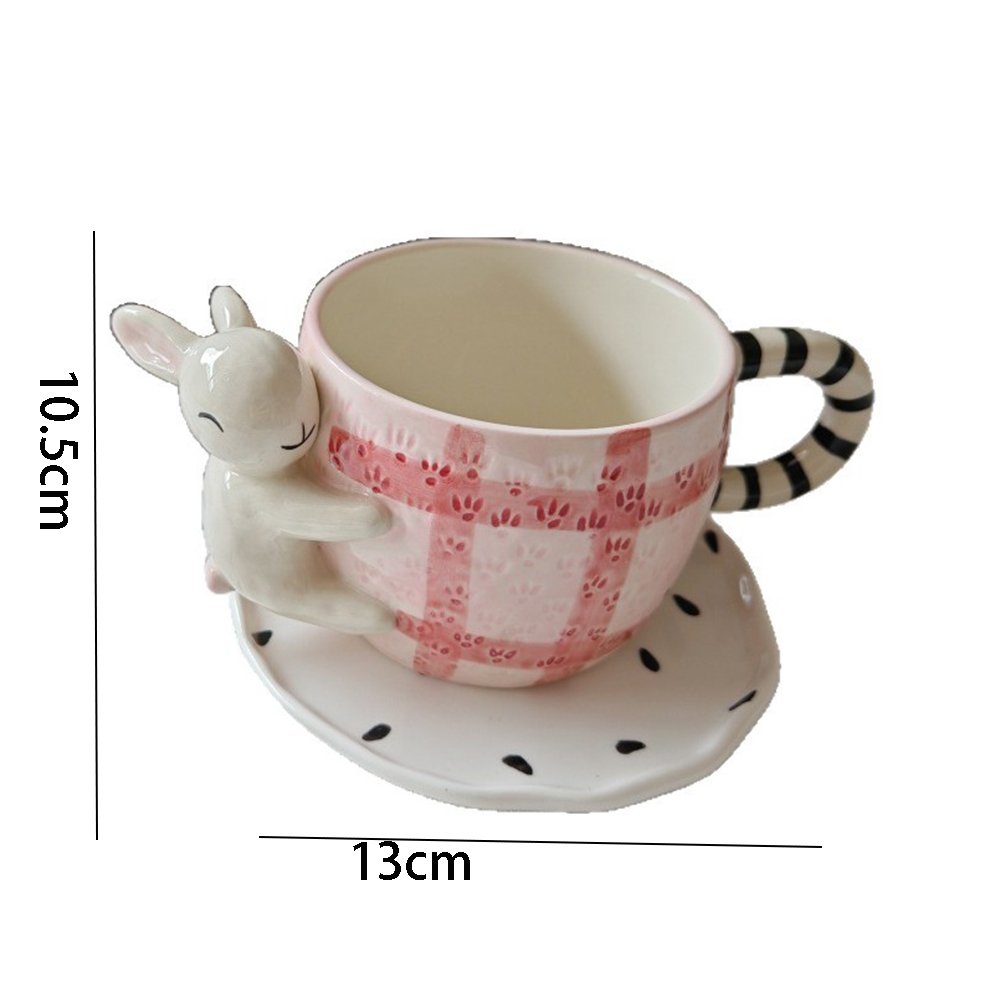 Unique Aesthetic Details: Features a pink plaid pattern with paw prints, a black-and-white striped handle, and a matching saucer, creating a cohesive and eye-catching look.