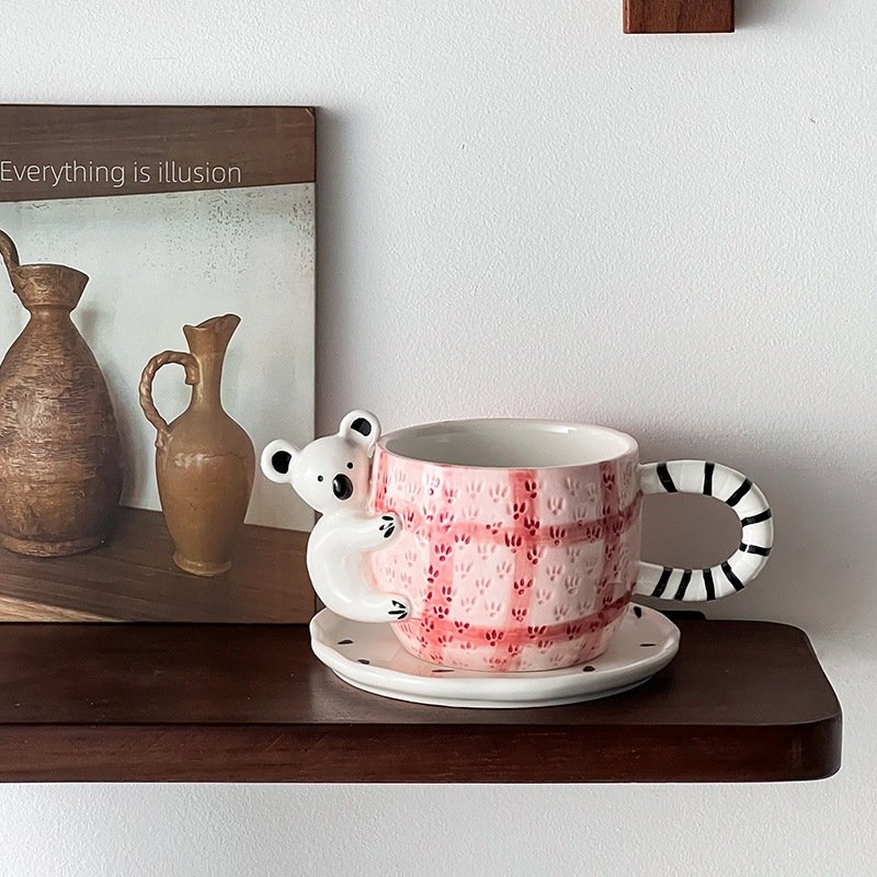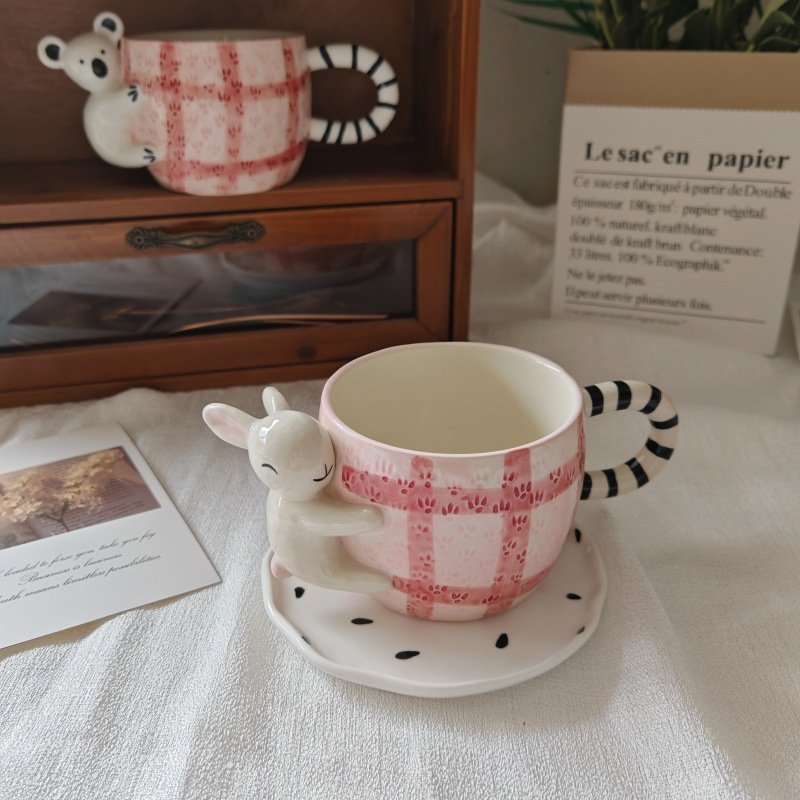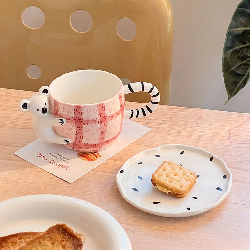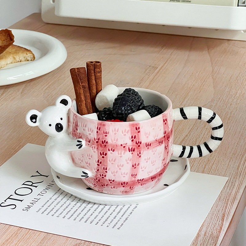 3D Koala Ceramic Mug with Saucer – Pink Plaid Pattern & Striped Handle for Coffee, Tea Enthusiasts