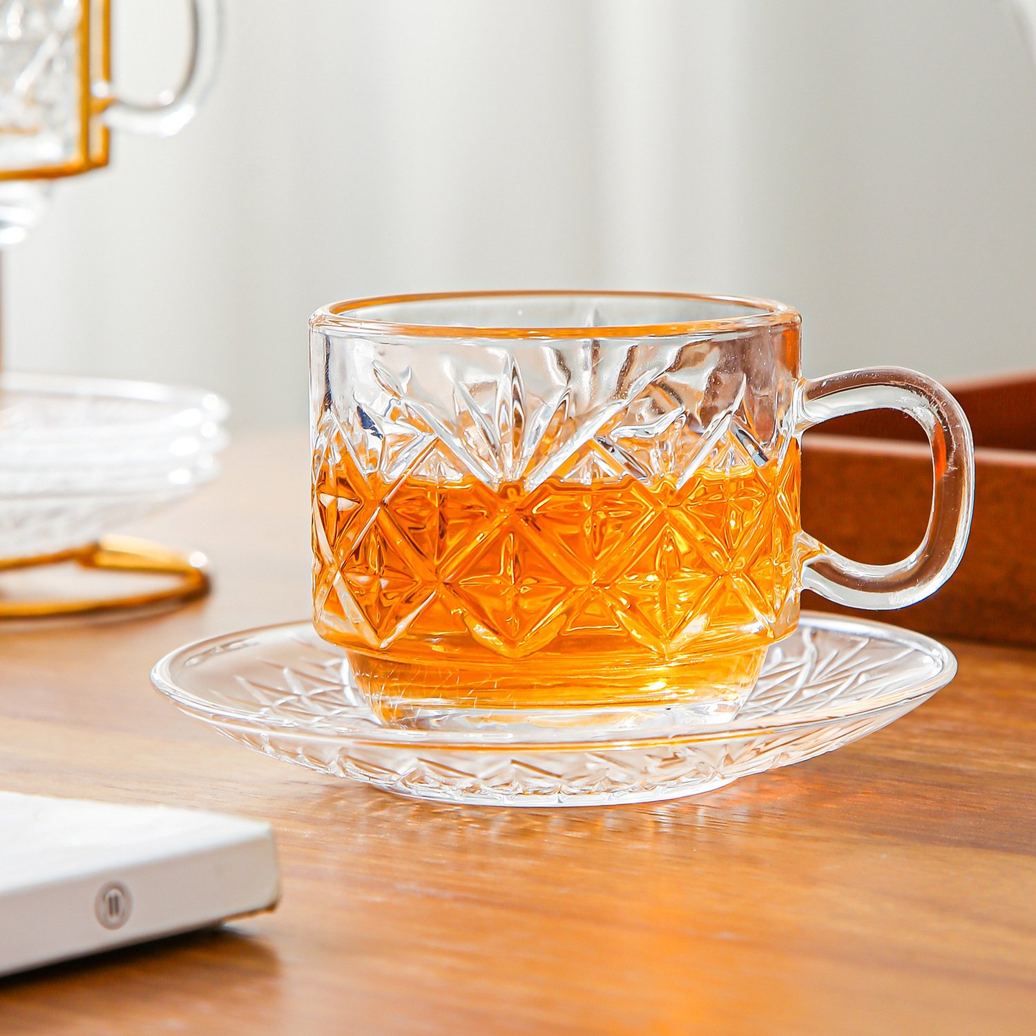Clear Glass Tea Cup and Saucer Set with Golden Metal Rack