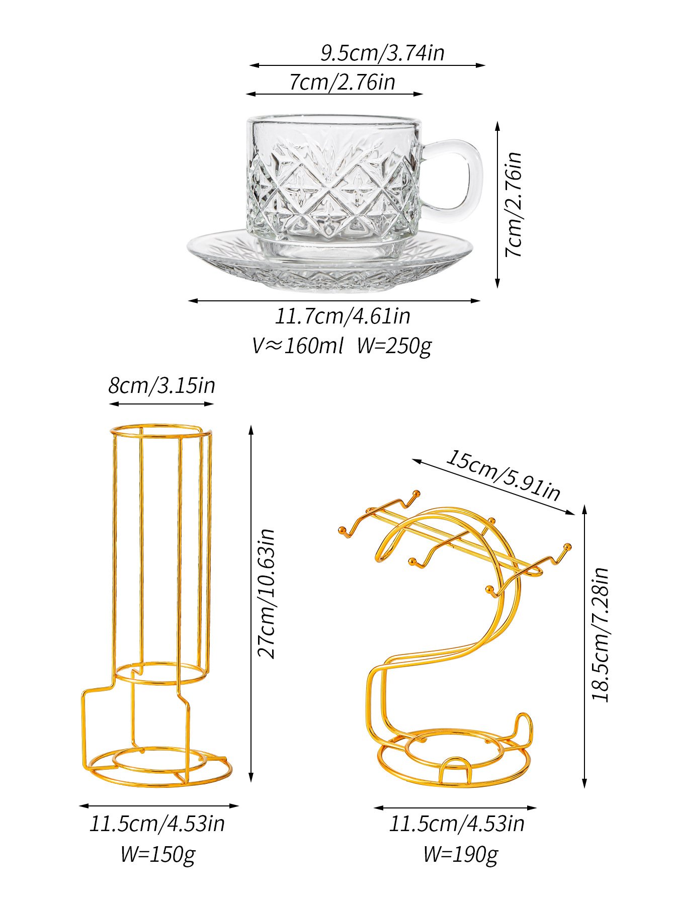 Convenient Storage: Comes with a golden metal rack that can hold multiple cups and saucers, keeping your tableware organized and saving space in your kitchen or dining area.