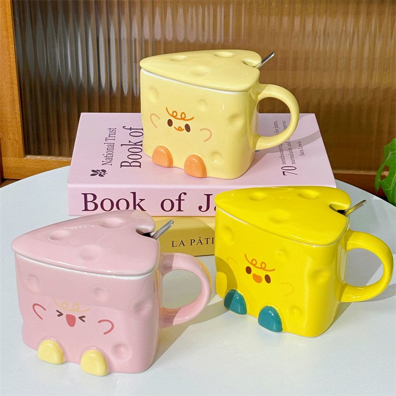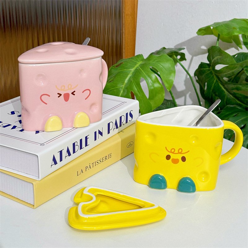 Cute Cheese-Shaped Ceramic Mugs with Lid and Spoon – Adorable Cartoon Design for Coffee, Tea Lovers