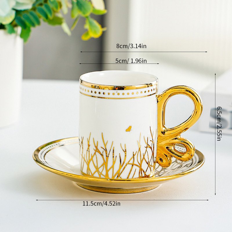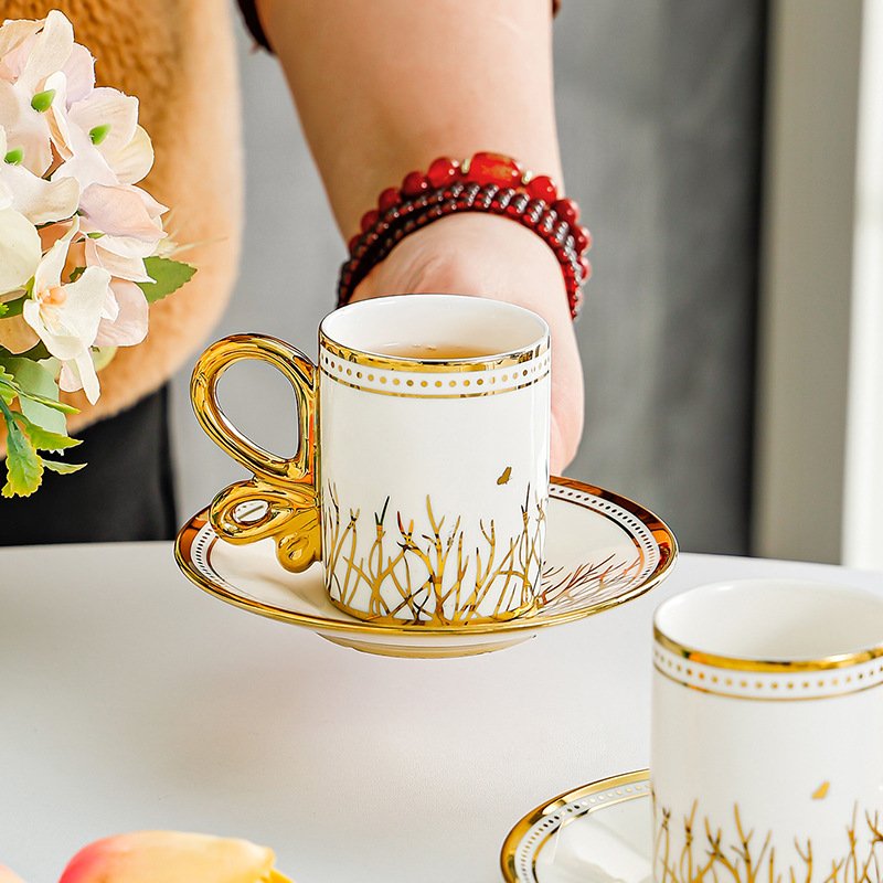 Golden-Embellished Ceramic Espresso Cup and Saucer Set: Elevate Your Coffee Ritual with Elegance