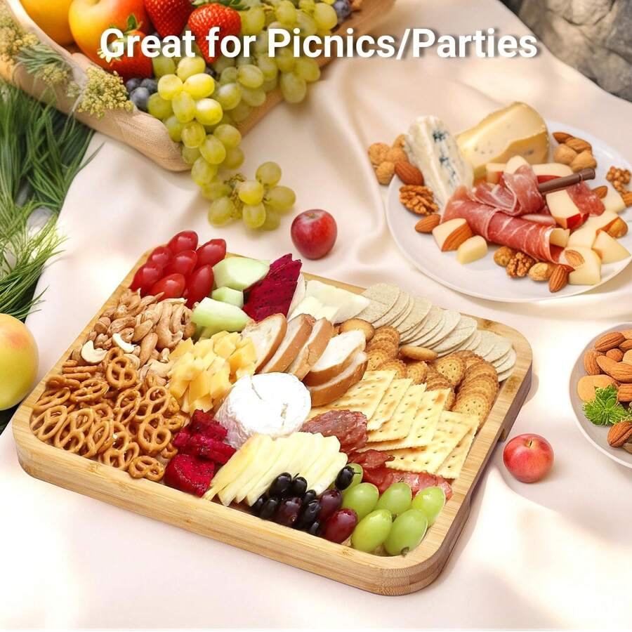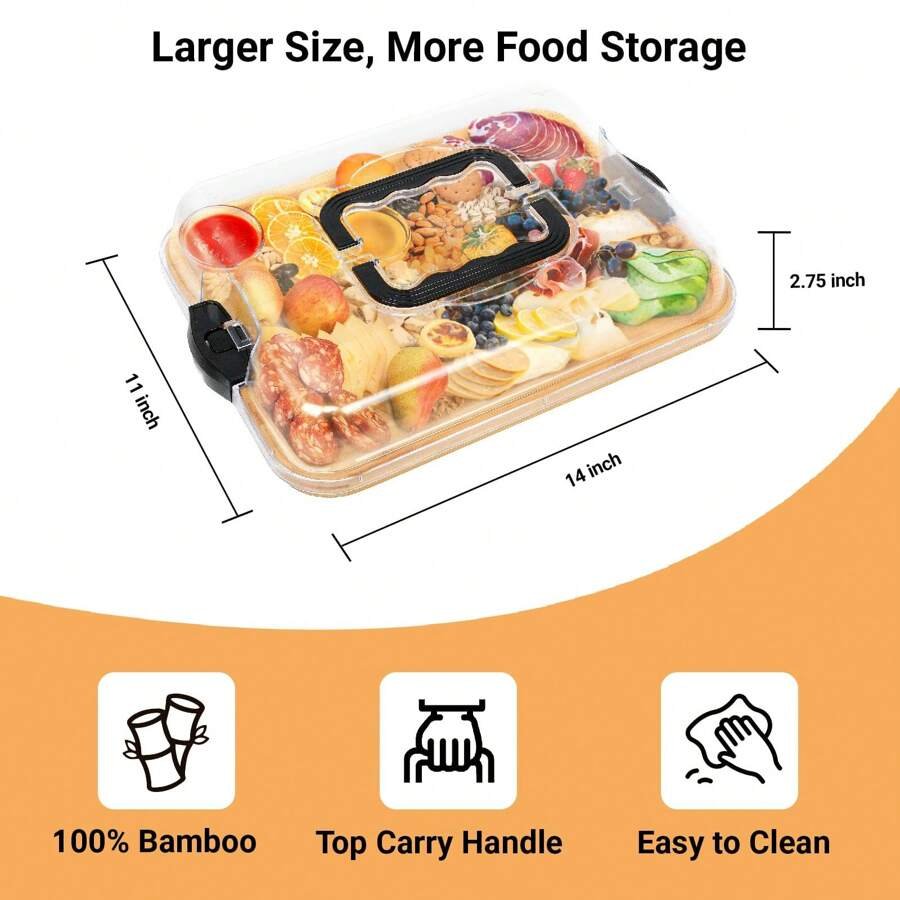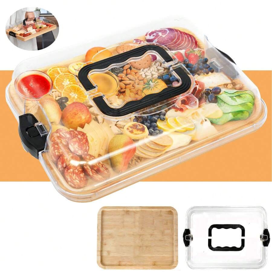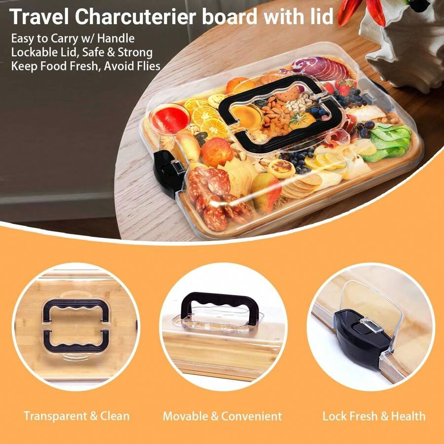 “Travel Bamboo Charcuterie Board: Fresh, Portable Snack Display with Lockable Lid”